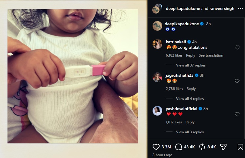 तस्वीर के साथ दीपिका ने कैप्शन में नजरबट्टू (इविल आई) इमोजी शेयर की, जो इस खुशखबरी को एक प्यारा और निजी स्पर्श देता है। इस पोस्ट के वायरल होते ही फैंस ने कमेंट सेक्शन में प्यार और शुभकामनाओं की बारिश कर दी। बॉलीवुड इंडस्ट्री से भी कई सितारों ने इस खुशखबरी पर अपनी खुशी जाहिर की। Bhumi Pednekar और Samantha Ruth Prabhu समेत कई सेलेब्स ने कपल को बधाई दी।