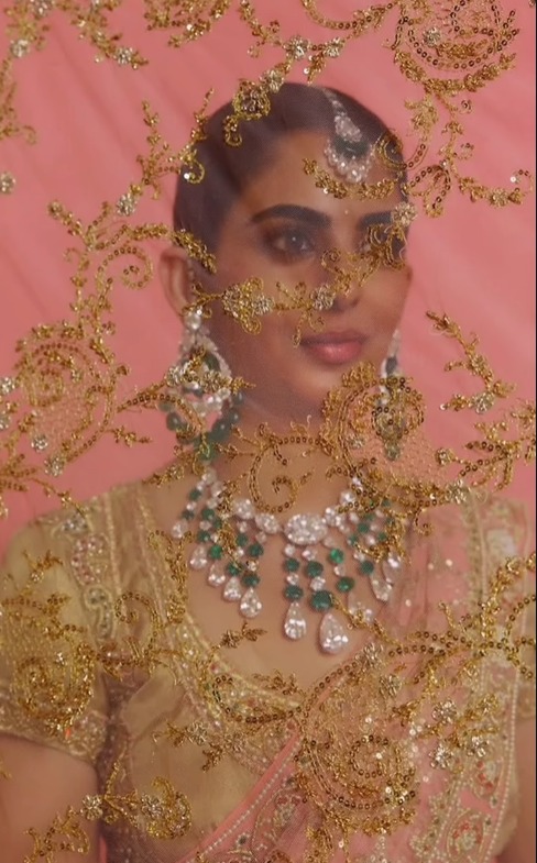 ईशा के लुक का सबसे आकर्षक हिस्सा उनकी जूलरी रही। उन्होंने हीरे और पन्ने से सजा स्टेटमेंट नेकलेस पहना, जिसमें चोकर स्टाइल और लेयर्ड डिजाइन का खूबसूरत मेल था। इसके साथ मैचिंग झुमके, कंगन और मांग टीका ने लुक को और भव्य बनाया। बालों में लगाया गया डायमंड हेयर एक्सेसरी भी खास आकर्षण का केंद्र रहा।
