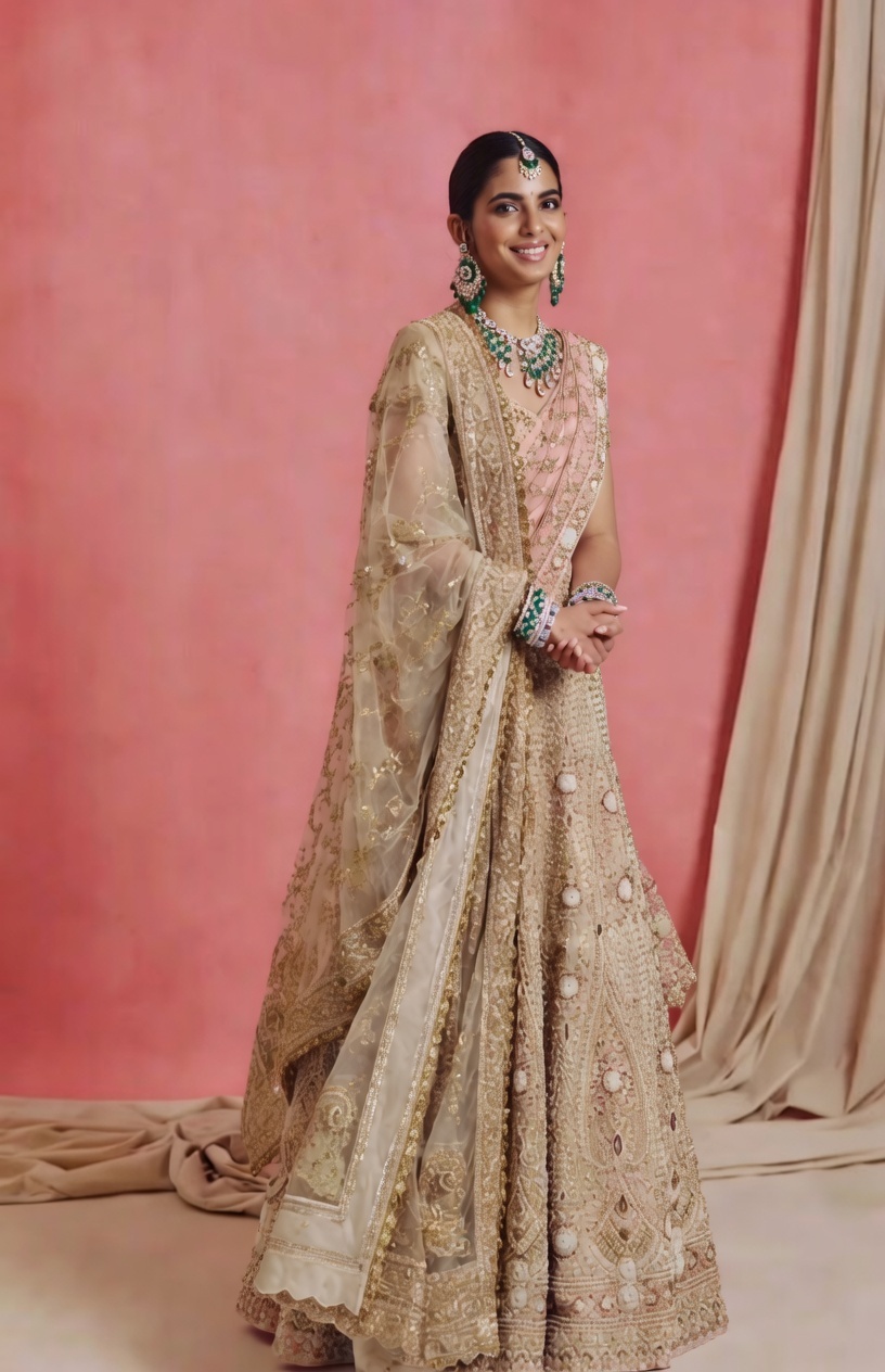 ईशा ने इस खास अवसर के लिए मशहूर डिजाइनर जोड़ी अबू जानी और संदीप खोसला का कस्टम डिजाइन किया हुआ गोल्डन लहंगा चुना। यह लहंगा गोल्ड जरदोजी की बारीक हैंड एम्ब्रॉयडरी से सजा था, जिसमें मोती, क्रिस्टल, रूबी और पन्नों का खूबसूरत संयोजन देखने को मिला। ट्यूल फैब्रिक पर की गई पारंपरिक कारीगरी ने पूरे आउटफिट को रॉयल और एलिगेंट अपील दी।