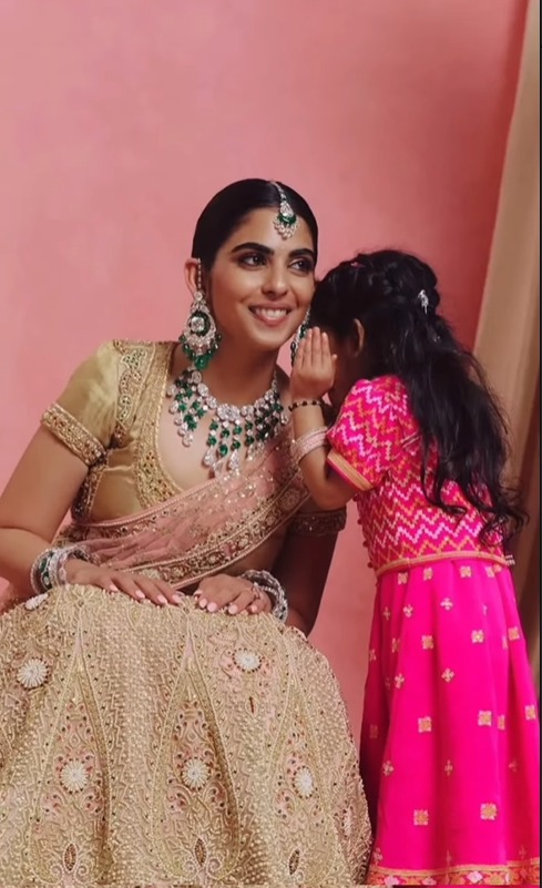 इस खास मौके पर ईशा की नन्ही बेटी भी पारंपरिक लुक में बेहद प्यारी लगीं। पिंक पटोला घाघरा-चोली और हल्की जूलरी के साथ उनका लुक मां के साथ खूबसूरत ट्विनिंग करता दिखा, जिसने पूरे समारोह में सबका ध्यान खींचा।