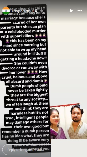 कंगना रनौत ने इंस्टा स्टोरी में कहा, एक महिला शादी से इंकार नहीं कर सकती। लेकिन, अपने प्रेमी के साथ मिलकर पति की हत्या का प्लान कर सकती है? कंगना रनौत ने सोनम को ‘क्रूर, जघन्य और बेतुका, मूर्ख’ और बेवकूफ औरत’ बताया। उन्होंने आगे कहा, मूर्ख लोगों को कभी हल्के में नहीं लेना चाहिए…बुद्धिमान लोगों को नुकसान पहुंचा सकते हैं। मूर्खों को पता ही नहीं होता कि वह क्या कर रहे हैं? अपने आस पास के मूर्खों से सचेत रहें।