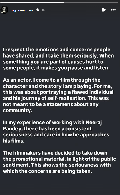 मनोज बाजपेयी ने सोशल मीडिया पर एक लंबा बयान साझा करते हुए कहा कि वह लोगों की भावनाओं और चिंताओं को पूरी गंभीरता से लेते हैं। उन्होंने लिखा कि जब किसी रचना से किसी वर्ग को ठेस पहुंचती है, तो कलाकार के तौर पर यह जरूरी हो जाता है कि वह रुककर उनकी बात सुने।