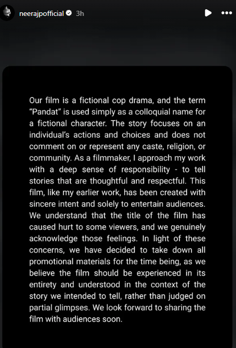 फिल्म के निर्माता नीरज पांडे ने भी इंस्टाग्राम पर एक विस्तृत बयान जारी कर विवाद पर अपनी बात रखी। उन्होंने कहा कि ‘घूसखोर पंडित’ एक काल्पनिक पुलिस ड्रामा है, जिसमें ‘पंडित’ शब्द का इस्तेमाल केवल एक काल्पनिक किरदार के उपनाम के तौर पर किया गया है। नीरज पांडे ने स्पष्ट किया कि फिल्म की कहानी पूरी तरह एक व्यक्ति के कर्मों और उसके फैसलों पर आधारित है। इसका उद्देश्य किसी जाति, धर्म या समुदाय का प्रतिनिधित्व करना या उस पर टिप्पणी करना बिल्कुल नहीं है।