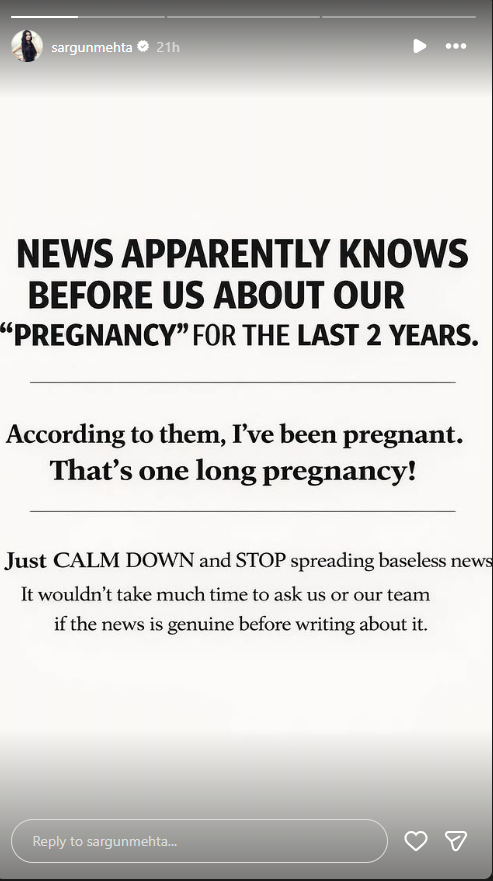 सरगुन ने अपने सोशल मीडिया अकाउंट पर एक पोस्ट शेयर करते हुए मीडिया और अफवाह फैलाने वालों पर तंज कसा। उन्होंने लिखा कि कुछ लोगों को उनकी प्रेग्नेंसी की खबर उनसे और उनके पति से पहले ही मिल गई वो भी पिछले दो साल से। उन्होंने मजाकिया अंदाज में कहा कि अगर ऐसा है तो यह “बहुत लंबी प्रेग्नेंसी” हो गई। साथ ही उन्होंने अपील की कि बिना पुष्टि के ऐसी खबरें फैलाने से बचना चाहिए।