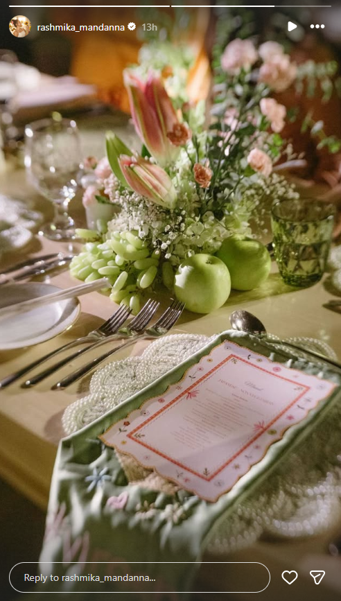 रश्मिका ने भी अपने वेडिंग वेन्यू की सजावट की तस्वीर साझा की, जिसमें खूबसूरती से सजी टेबल, पिंक लिली और हल्के हरे हाइड्रेंजिया फूलों की सजावट नजर आई। टेबल पर रखे ग्रीन एप्पल, अंगूर और प्रिंटेड मेन्यू कार्ड से संकेत मिला कि मेहमानों के लिए खास जापानी व्यंजन तैयार किए गए हैं। यह डिटेलिंग समारोह की खास योजना को दर्शाती है।