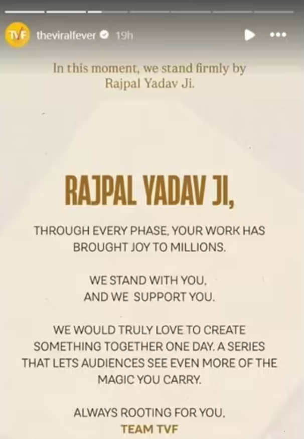 TVF, जिसने ‘पंचायत’, ‘कोटा फैक्ट्री’ और ‘गुल्लक’ जैसे चर्चित और दर्शकों के दिलों के करीब शोज बनाए हैं, ने सोशल मीडिया के जरिए एक भावुक संदेश साझा किया। टीम ने लिखा कि इस कठिन समय में वे राजपाल यादव के साथ मजबूती से खड़े हैं और उनके योगदान को सलाम करते हैं।